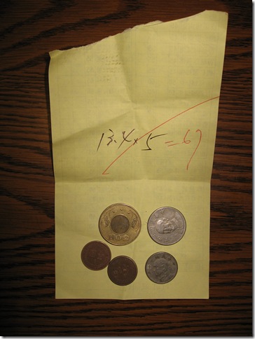 老渡邊再拿去給門口的老闆, 結果面前擺了一大堆零錢的大老闆用計算機乘了一下, 給了老渡邊 67元~~~~~