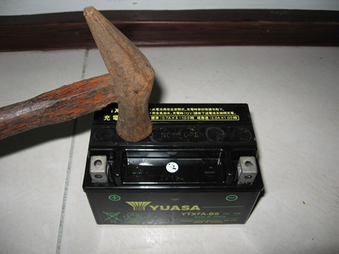 b.新ㄉ電池買回來也是要注意,裡面會有一盒電解液,是要自己加入電池裡面,那個液體就是俗稱ㄉ稀硫酸,可別碰到手和眼睛,那可是有毒ㄉ!如果誤觸ㄉ話,要趕快用大量ㄉ清水沖洗.