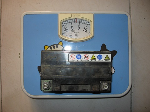 要回收賣錢了, 來秤一下三顆老電瓶的總重吧, 約6公斤左右.